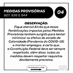Fique atento! Ainda que essas flexibilizações impostas pelas Medidas Provisórias tenham surgido para tentar minimizar os efeitos do estado de Calamidade (Pandemia do COVID-19) e manter empregos, é certo que, a Constituição Federal deve ser sempre respeitada, além disso, todas as medidas devem respeitar requisitos devidamente previstos.